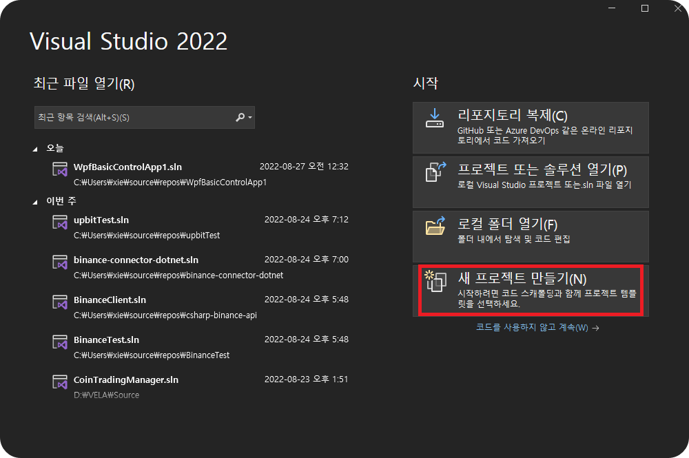 1. Visual Studio 실행 후, 새 프로젝트 만들기 클릭