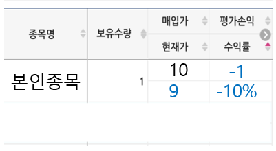 해당 종목에 대한 평가손익은 -1달러, 수익률은 -10% 로 나오게 된다.