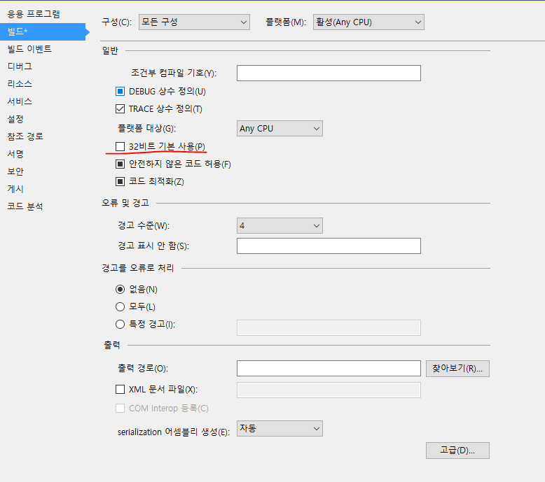 프로젝트 속성에서 32비트 기본 사용 체크를 해제하여 문제를 해결했다.