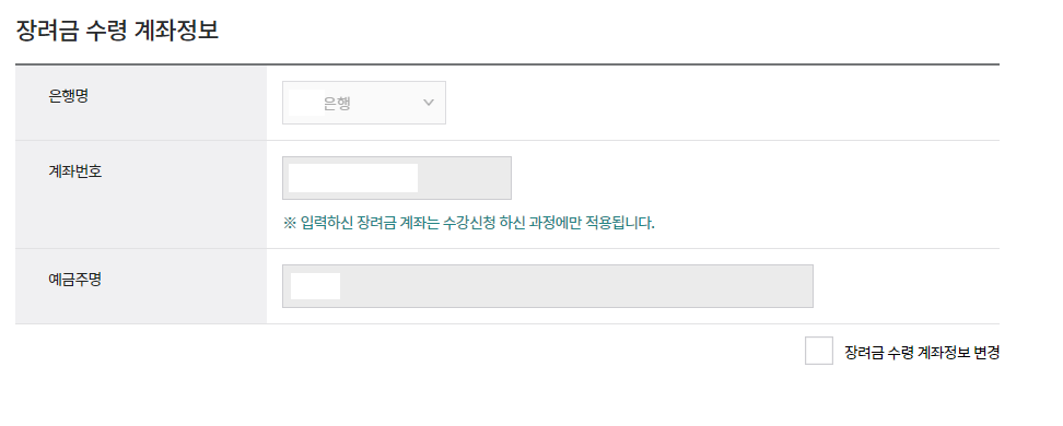 해당 정보 입력 창에서 스크롤 좀 아래로 내리다 보면, 장려금 수령 계좌정보라고 있음.