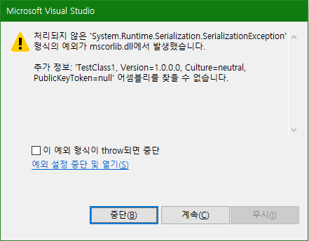 처리되지 않은 'System.Runtime.Serialization.SerializationException' 형식의 예외가 mscorlib.dll에서 발생했습니다.