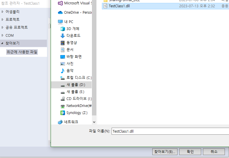 * 찾아보기에서 내가 작성한 dll 경로 찾아서 추가하기.