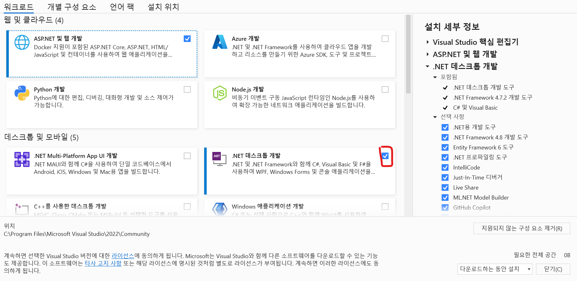 4. 자신이 사용할 언어설정 (C# 이므로, 필자는 .Net Freamwork 기반으로 설치)